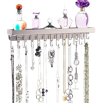 Angelynn S Jewelry Organizer Wall Mount Hanging Necklace Holder Bracelet Hooks Closet Storage Rack Tray Schelon Satin Nickel Silver